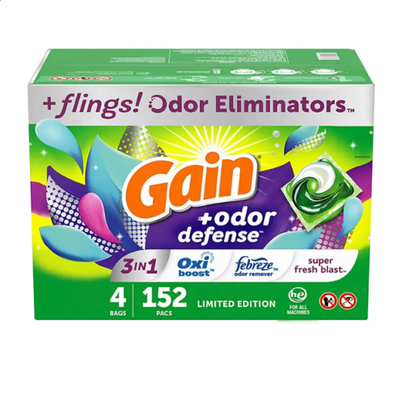 Gain Flings! Liquid Laundry Detergent Pacs + Odor Defense, Super Fresh Blast Scent (152 ct.)