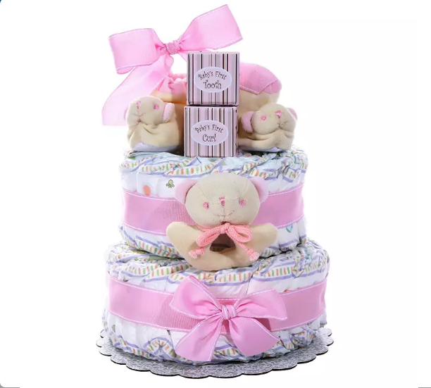 This adorable diaper cake is?a useful and thoughtful gift for the your favorite future mom.?This two-tier cake is filled with 40 diapers, baby’s first tooth box, baby’s first curl box, soft bear booties, and a soft bear rattle.