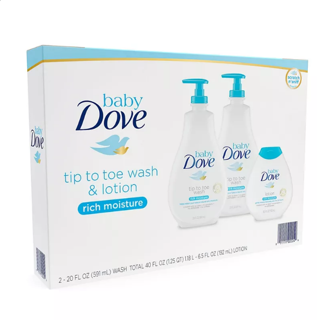 Baby Dove Rich Moisture Tip to Toe Baby Wash is mild and nourishing, ideal for daily use. Wet baby’s hair and skin with warm water and wash gently with hands or wash cloth. Follow with Baby Dove Rich Moisture Baby Lotion to lock in moisture for 24 hours.