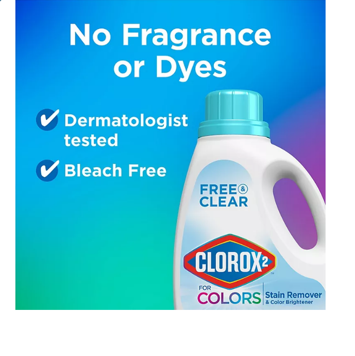 Gentle on sensitive skin, this dermatologist-tested, hypoallergenic stain remover contains no perfumes or dyes. Add this #1 liquid stain remover to every wash load with detergent for color brightening power and total clean. Safe for use in standard and HE washers and all washable fabrics, color and white loads. Win the battle against tough stains and keep clothes bright and looking new with Clorox 2? for Colors – Free & Clear Stain Remover and Color Brightener.