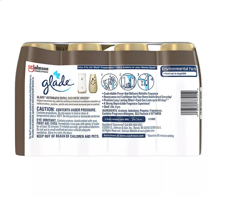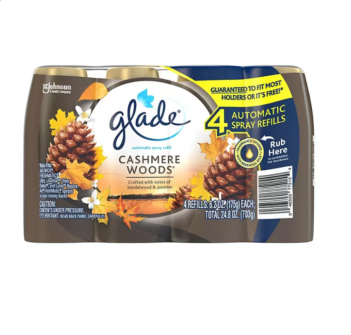 When using Glade Automatic Spray Air Freshener Refill, you don’t have to fuss over clicking a button time and time again. The automatic spray air freshener will put out a burst of fragrance every few minutes to remove and cover up any scents you don’t want. With four refills in each package, you will be set to place a Glade spray in every room that you spend time in. Installing a new Glade automatic spray refill is super simple and takes only a moment of your time.