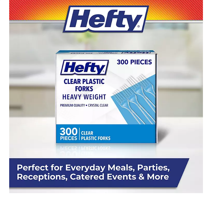 Hefty Clear Heavy Weight Plastic Forks (300 ct.) deliver the Hefty strength and reliability you know you can trust. The crystal clear design matches any party décor or table setting, making them perfect for your next occasion or special event.?