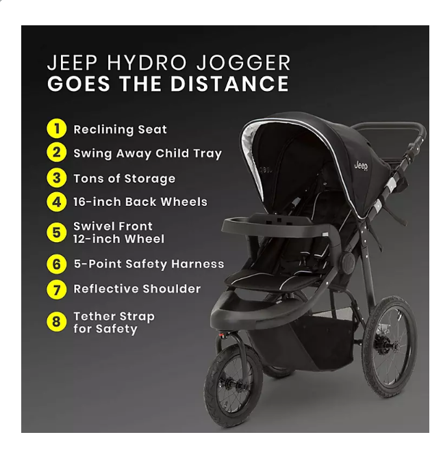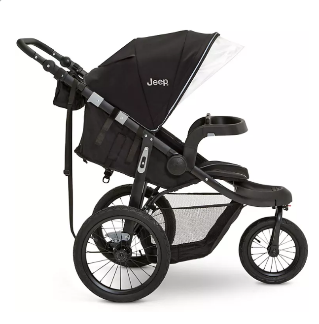 With the Jeep Hydro Sport Plus Jogger by Delta Children you and your baby can go the distance! A versatile jogging stroller, it delivers the best running experience with its swivel front wheel and back-wheel suspension that smooths out the bumps to provide a comfortable ride for your little one. The oversized and adjustable neoprene canopy with pop out UPF 50+ sun protection is water-repellant and features a peek-a-boo window that lets you keep an eye on your child as you run or walk. For your child’s comfort, the reclining seat and swing away child tray allow little ones to happily nap or snack. You’ll love the adjustable handlebar that’s wrapped in leather and features multiple height positions, as well as the large storage basket and parent fabric organizer with 2 cup holders and covered storage to keep your keys or phone within easy reach. Quick release back tires create a compact fold that makes it great for small cars with limited cargo space. Recommended use: Infants up to 50 lbs. For added convenience, convert this jogger into a travel system with the included car seat adapter. Included car seat adapter fits the following car seats (car seats sold separately): Graco SnugRide Click Connect Evenflo Nurture; Evenflo Embrace Britax B-Safe 35 Chicco KeyFit 30 Since 1941, the Jeep brand has been a symbol of freedom and expression. Influenced by a love of the great outdoors, Jeep kids’ products are created for little adventurers.