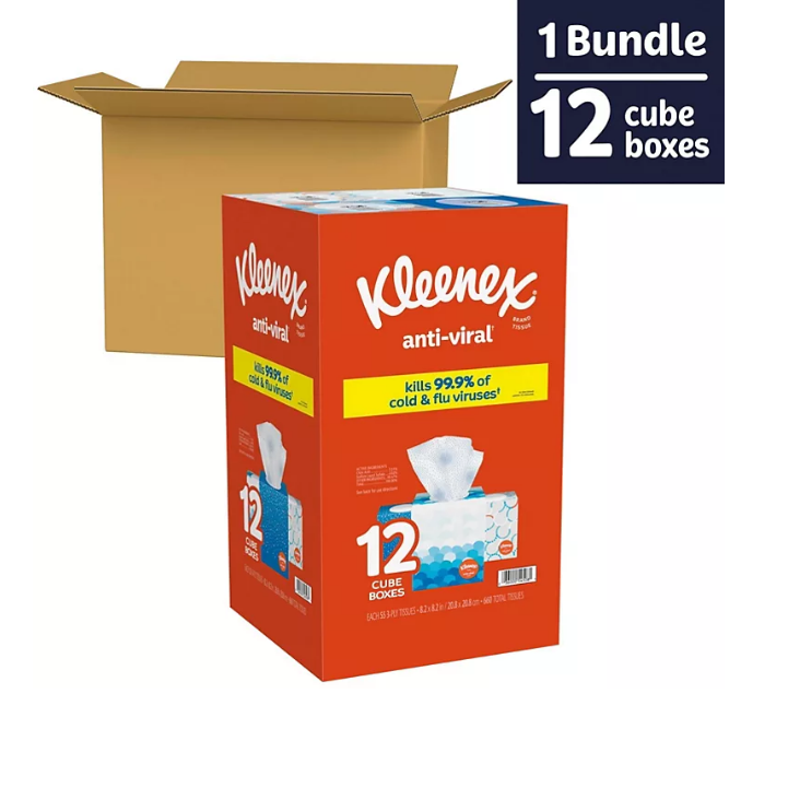 Kleenex Anti-Viral 3-Ply Facial Tissues, Cube Boxes (55 tissues/box, 12 boxes)