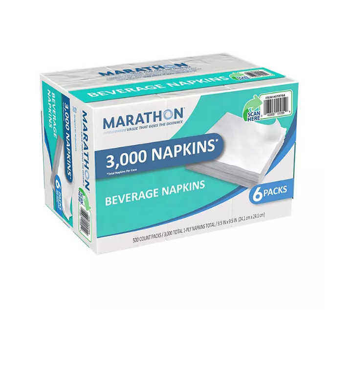 Marathon? 1-ply embossed white beverage napkins offer premium quality at an affordable price. These napkins are perfect for everyday use or special occasions. With a simple, elegant design they are an ideal choice for catering events, restaurants, lodging and breakrooms or anywhere that cocktails, soft drinks, fruit juices or coffee are served. An embossed texture provides softness and absorbency that your patrons or guests will appreciate. Each box of Marathon Beverage Napkins contains 6 packs of 500 napkins for 3,000 total napkins. Each napkin is folded to a convenient size of 4.75″ x 4.75″.