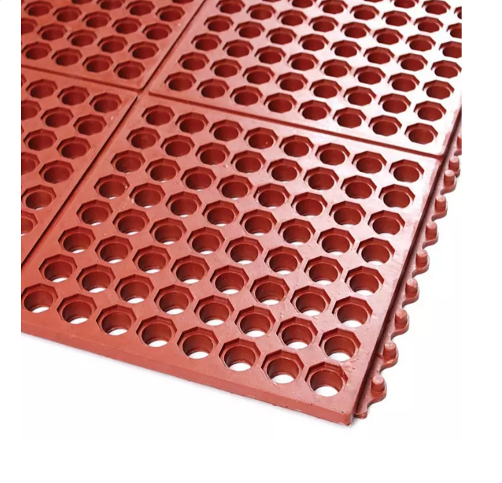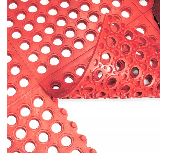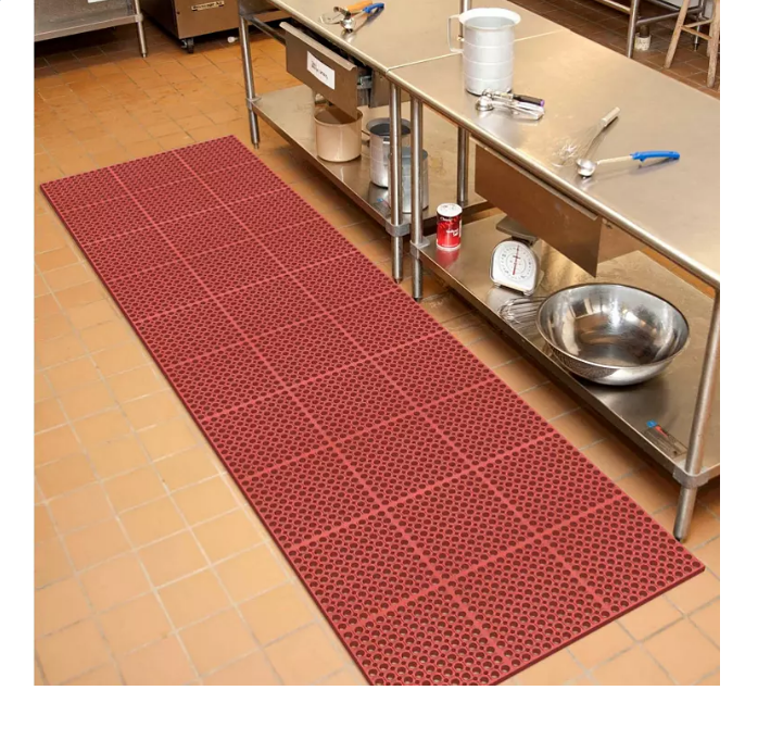 The modular cell design of this kitchen floor mat allows liquids to easily flow through it. It features a nib backing that elevates it above the surface for improved drainage of oils and grease. This rubber kitchen mat has one side with built-in, interlocking connectors to join multiple pieces securely together, letting you quickly create a larger unit to fit a wider space.