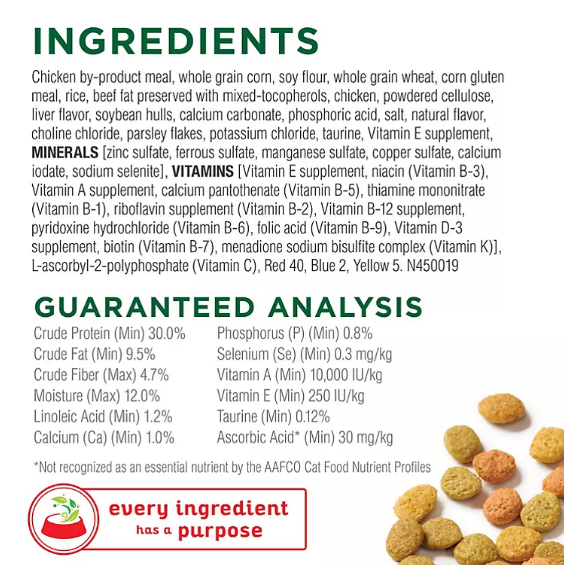 Chicken By-product Meal, Whole Grain Corn, Soy Flour, Whole Grain Wheat, Corn Gluten Meal, Rice, Beef Fat Preserved With Mixed-tocopherols, Chicken, Powdered Cellulose, Liver Flavor, Soybean Hulls, Calcium Carbonate, Phosphoric Acid, Salt, Natural Flavor, Choline Chloride, Parsley Flakes, Potassium Chloride, Taurine, Vitamin E Supplement, Minerals [Zinc Sulfate, Ferrous Sulfate, Manganese Sulfate, Copper Sulfate, Calcium Iodate, Sodium Selenite], Vitamins [Vitamin E Supplement, Niacin (Vitamin B-3), Vitamin A Supplement, Calcium Pantothenate (Vitamin B-5), Thiamine Mononitrate (Vitamin B-1), Riboflavin Supplement (Vitamin B-2), Vitamin B-12 Supplement, Pyridoxine Hydrochloride (Vitamin B-6), Folic Acid (Vitamin B-9), Vitamin D-3 Supplement, Biotin (Vitamin B-7), Menadione Sodium Bisulfite Complex (Vitamin K)], L-ascorbyl-2-polyphosphate (Vitamin C), Red 40, Blue 2, Yellow 5. N450019