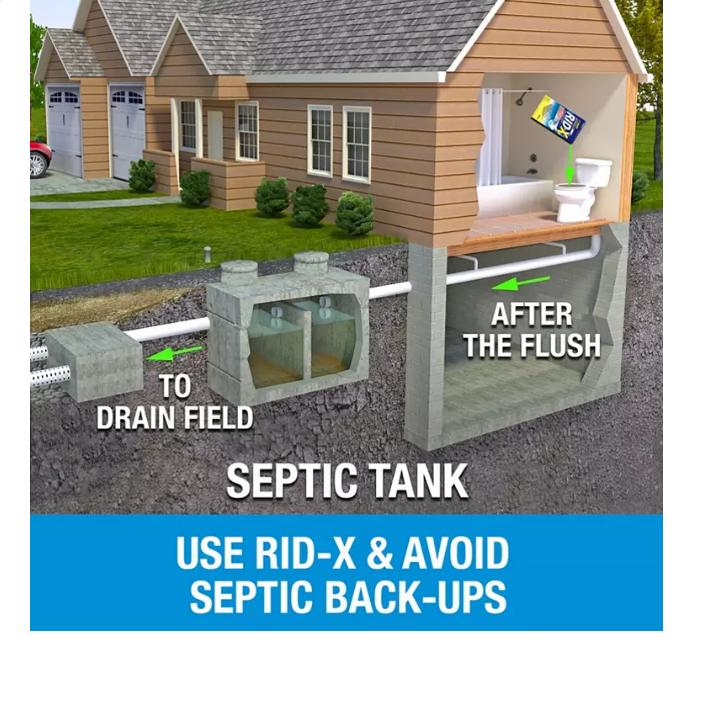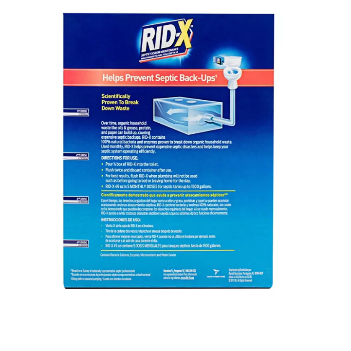 The RID-X septic tank treatment helps prevent septic backups** by quickly breaking down solid organic waste. The concentrated powder formula features billions of natural bacteria and advanced enzymes that get to work immediately, feeding on septic waste. Combined with pumping, regular use of RID-X helps maintain a healthy balance of septic bacteria to ensure a free-flowing septic system so you don’t have to worry about expensive backups.