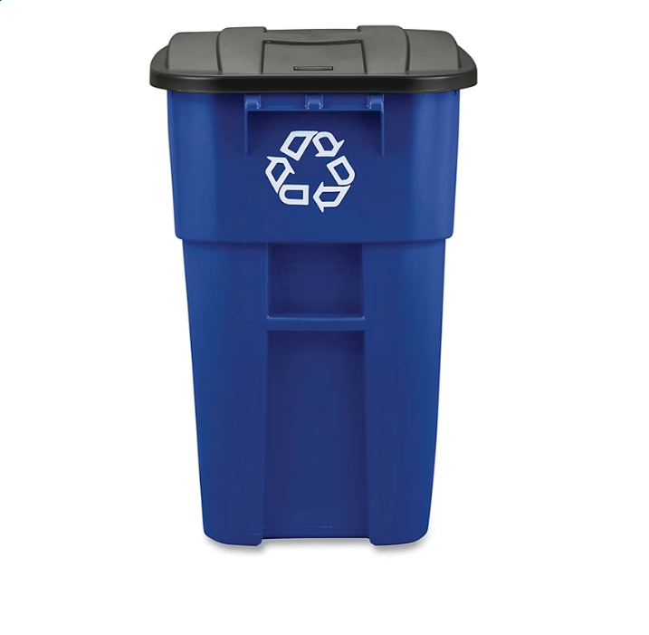 The Rubbermaid Commercial BRUTE Recycling Rollout Trash Can with Hinged Lid is a versatile fit where heavy volume is an issue serving as an efffective central collection point for multiple recycling stations. This blue container is imprinted with the universal recycling symbol for increased waste management compliance and features a molded-in catch bar making the recycle bin compatible with automated and semi-automated lift systems for curbside garbage and recycling collection.