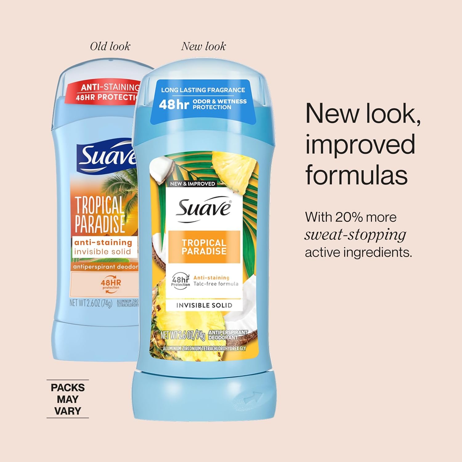 Suave Women’s Antiperspirant Deodorants now contain 20% more sweat-stopping ingredients than the original formulation, offering longer-lasting, more effective protection that is tough on sweat yet gentle on the skin.