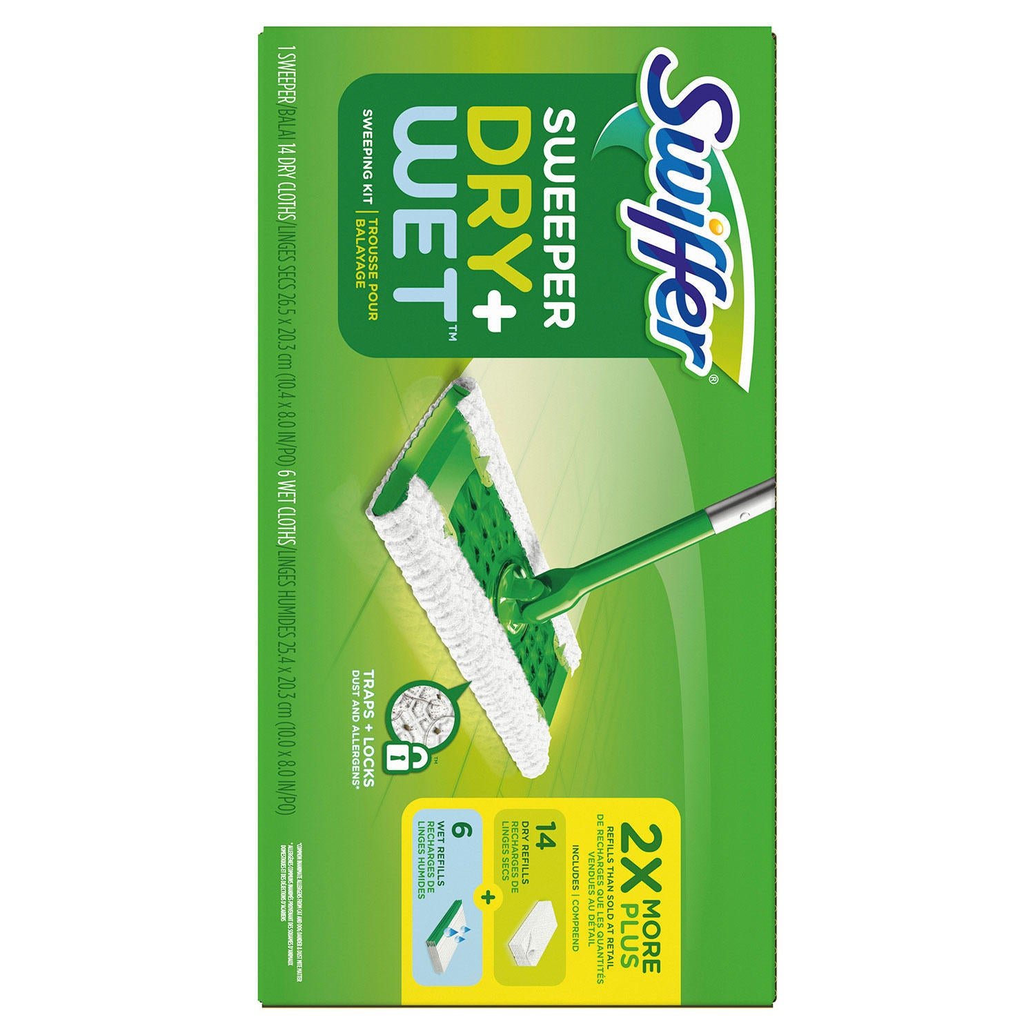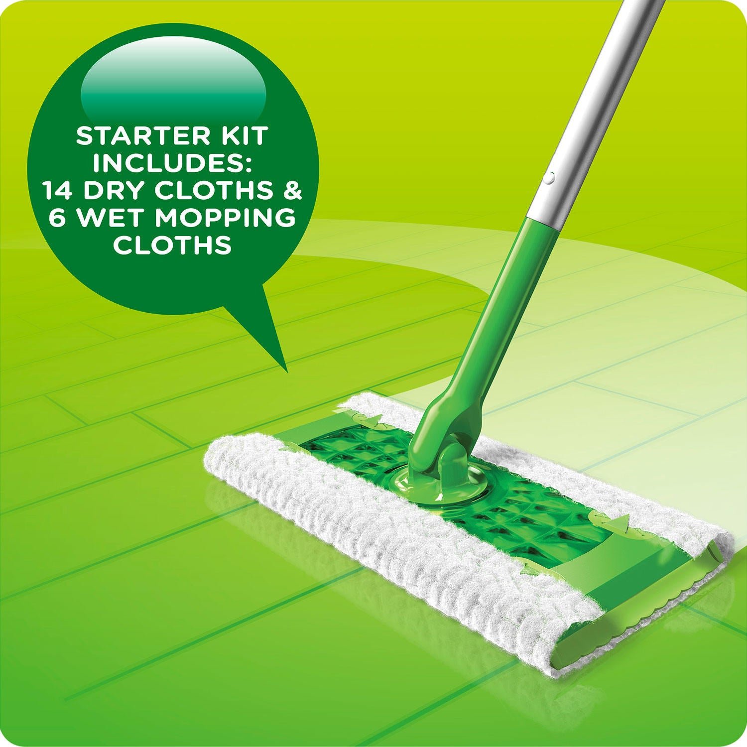 - Swiffer Sweeper starter kit includes a Sweeper, 14 dry sweeping cloths and 6 wet mopping cloths